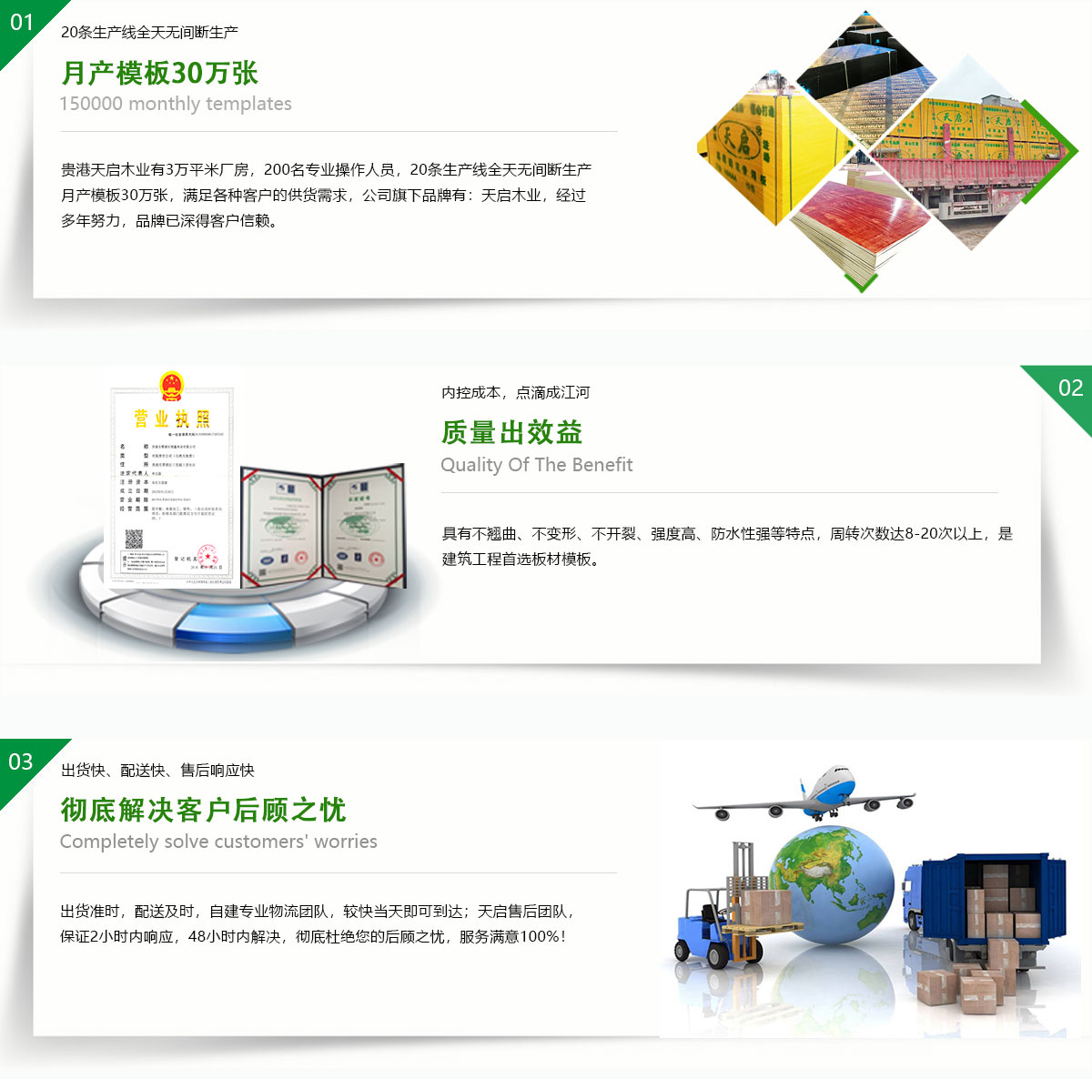 貴港市天啟木業(yè)位廣西貴港市覃塘區(qū),是中國建筑模行業(yè)規(guī)模十大的企業(yè)之一,有著優(yōu)越地理位置,臨廣東,貴州,湖南,云南、交通運(yùn)輸區(qū)位十分優(yōu)勢(shì),F(xiàn)有職工近300人,占地50余畝,其中建筑面積近3萬平方米。日產(chǎn)量2萬張,年產(chǎn)量500萬余張;公司正在逐步壯大,旗下有4家分公司,總年產(chǎn)量近1500萬張!天啟木業(yè)引進(jìn)芬蘭制膠技術(shù),采用先進(jìn)生產(chǎn)工藝。公司生產(chǎn)的建筑膜板采用優(yōu)質(zhì)的防水膠制作,循環(huán)使用次數(shù)多,品質(zhì)在同行業(yè)內(nèi)認(rèn)可度極高。是一家集產(chǎn)品研發(fā),生產(chǎn),銷售,服務(wù)于一體的綜合型大型民營企業(yè)。產(chǎn)品覆蓋全國20多個(gè)省,市,自治區(qū)。